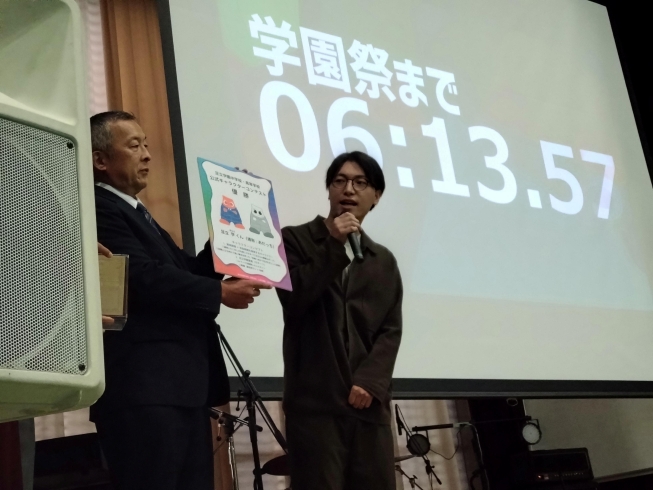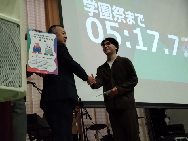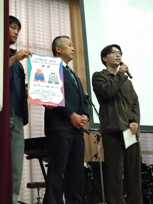 学園祭開会式に先立ち、マスコットキャラクターコンテストの優勝者への授賞式とキャラクターのお披露目を行いました。