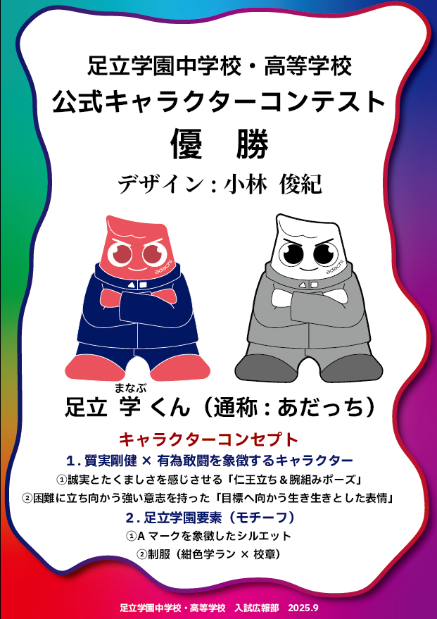 コンテストでは、在校生からの圧倒的支持を得て優勝の栄誉に輝き、審査の結果、足立学園のマスコットキャラクターに決定しました。