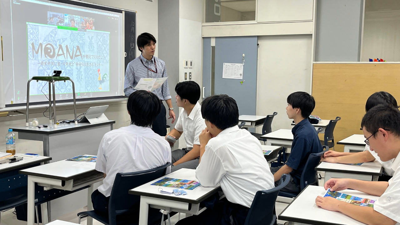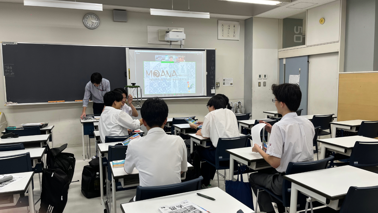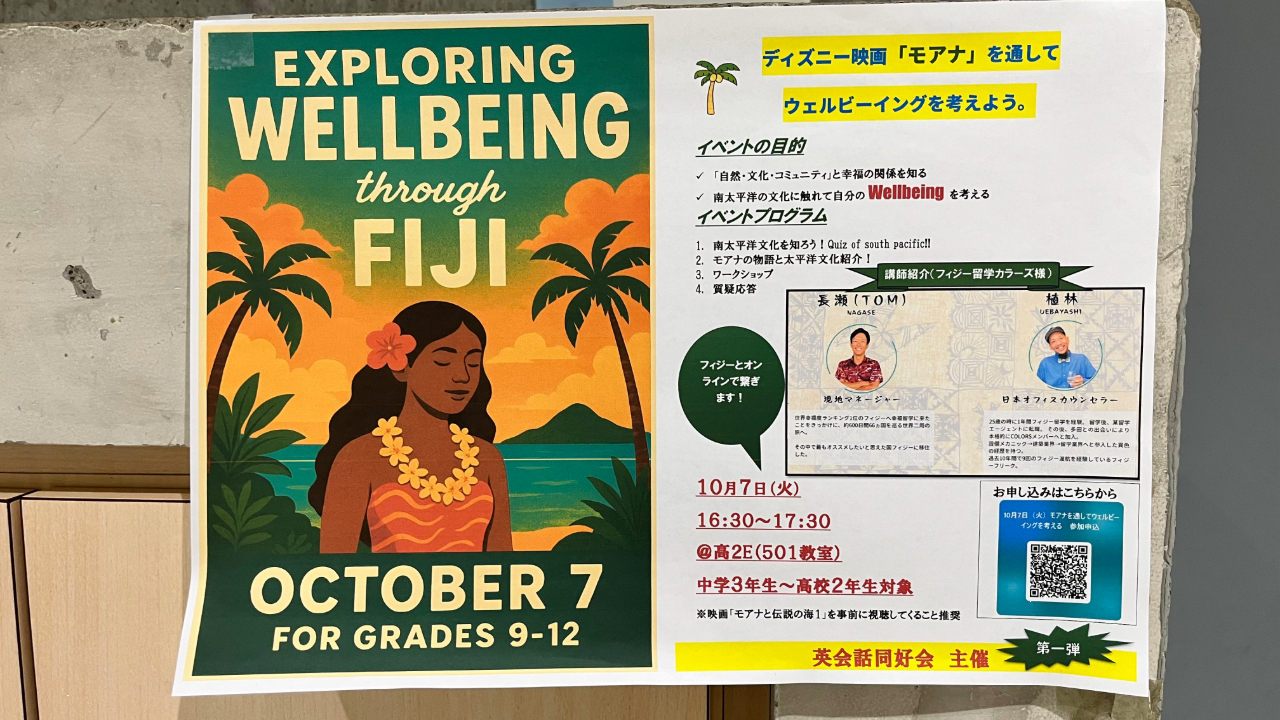 英会話同好会主催で、フィジーとオンラインで繋ぎ、南太平洋の文化を学んだり、ワークショップを行いました。