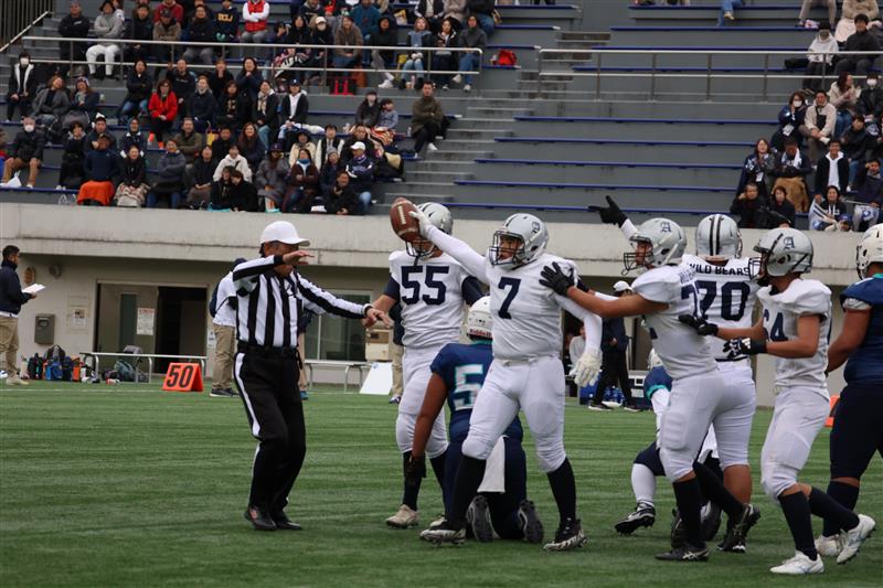前半、順調にゲインを重ねるも、肝心なところでインターセプトやファンブルで得点に結びつけることができず、苦しい状況が続きました。